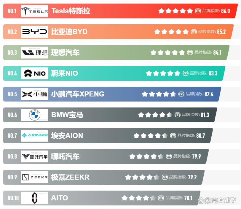 居前十的有:Tesla特斯拉、比亚迪BYD、理想汽车、蔚来NIO、小鹏汽车XPENG、BMW宝马、埃安AION、哪吒汽车、极氪ZEEKR、AITO等,上榜新能源汽车十大品牌榜单和著名新能源汽车品牌名单的是口碑好或知名度高、有实力的品牌,排名不分先后,仅供借鉴参考。