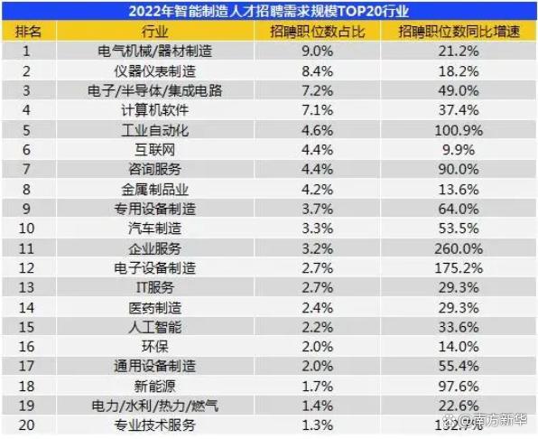 数据显示,从去年开始,智能制造行业需求的人才增速最快的岗位有:电气器械制造工程师、仪器仪表制造工程师、半导体工程师、计算机软件工程师、工业自动化工程师等等岗位的人才需求速度大幅度的增长,特别是工业自动化工程师是翻倍的需求增长。