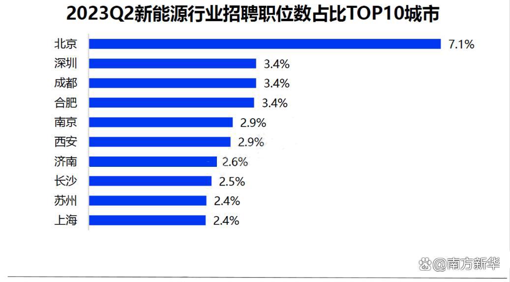 从城市来看,新能源行业招聘职位数排名前十的城市中,北京位居第一,占比7.1%。其次是深圳、成都、合肥,占比均为3.4%。其中就深圳城市而言,最为拥有较好的电化学储能材料与技术研发和产业化基础等先天优势,另外与之配套的充电设备也正在极速普及,深圳的新能源产业布局与发展,带动人才招聘需求快速增长,成为新能源人才的主要聚集地,是众多高端人才比较看好的一个城市。